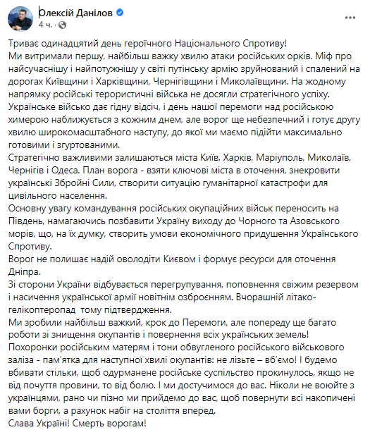 "Ни на каком направлении российские террористические войска не добились стратегического успеха. Украинское войско дает достойный отпор, и день нашей победы над русской химерой приближается с каждым днем, но враг еще опасен и готовит вторую волну широкомасштабного наступления, к которой мы должны подойти максимально готовыми и сплоченными", - говорится в сообщении Данилова в соцсети.