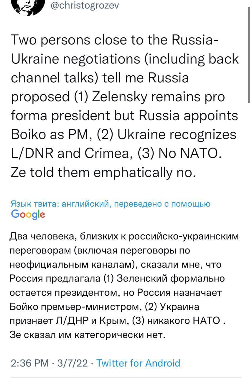 07:36 По просьбе Макрона к Путину Вооружённые силы РФ с 10:00 объявляют режим тишины и открывают гуманитарные коридоры из Киева, Мариуполя, Харькова, Сум.