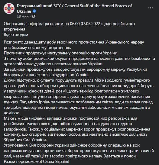 Сводка Генштаба ВСУ от 7 марта 2022 года