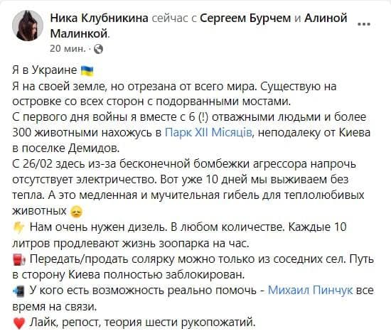22:29 Киевляне призывают оказать помощь животным в Парке XII Месяцев, который расположен неподалеку от Киева в поселке Демидов.