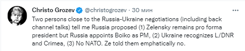 Журналист-расследователь Христо Грозев из Billingcat пишет, что, по данным его источников, помимо публично озвученных условий прекращения войны Россия якобы выдвигает ещё одно - назначение сопредседателя ОПЗЖ Юрия Бойко премьер-министром Украины.