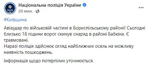 21:06 Нацполиция сообщает, что в результате авиаудара по военной части в Бориспольском районе под Киевом есть травмированные. Информация уточняется.