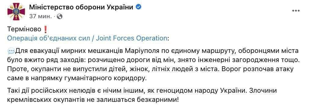 Впрочем, Минобороны Украины позже заявило, что эвакуация из Мариуполя сорвана россиянами, которые "начали атаку в направлении гуманитарного конвоя".