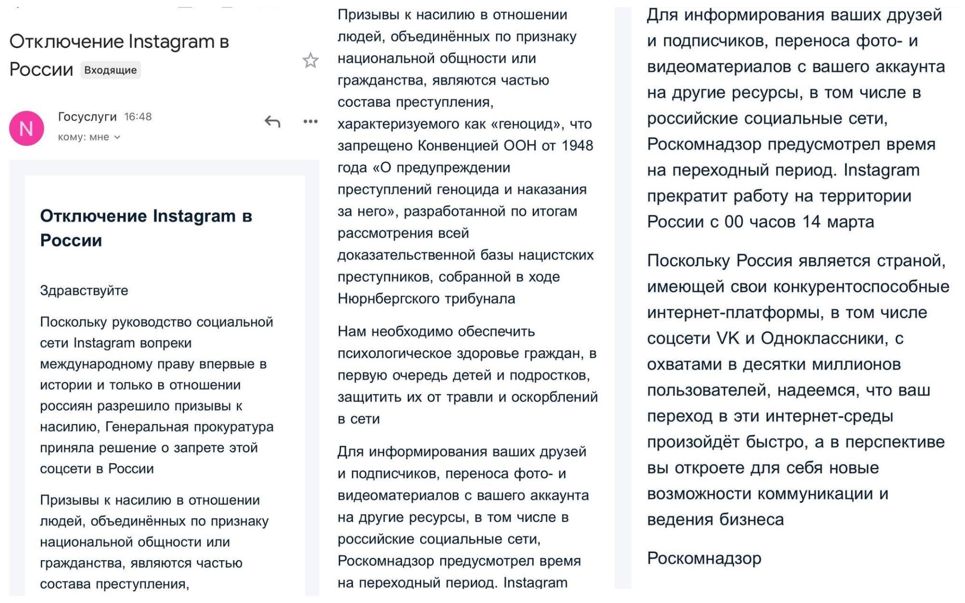 19.04 Всем, кто зарегистрировал свой инстаграм в России, пришли письма об отключении приложения по решению Роскомнадзора.