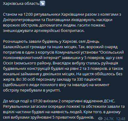 Российская авиация нанесла бомбовый удар по Оскольскому психоневрологическому интернату, который находится близ Изюма.