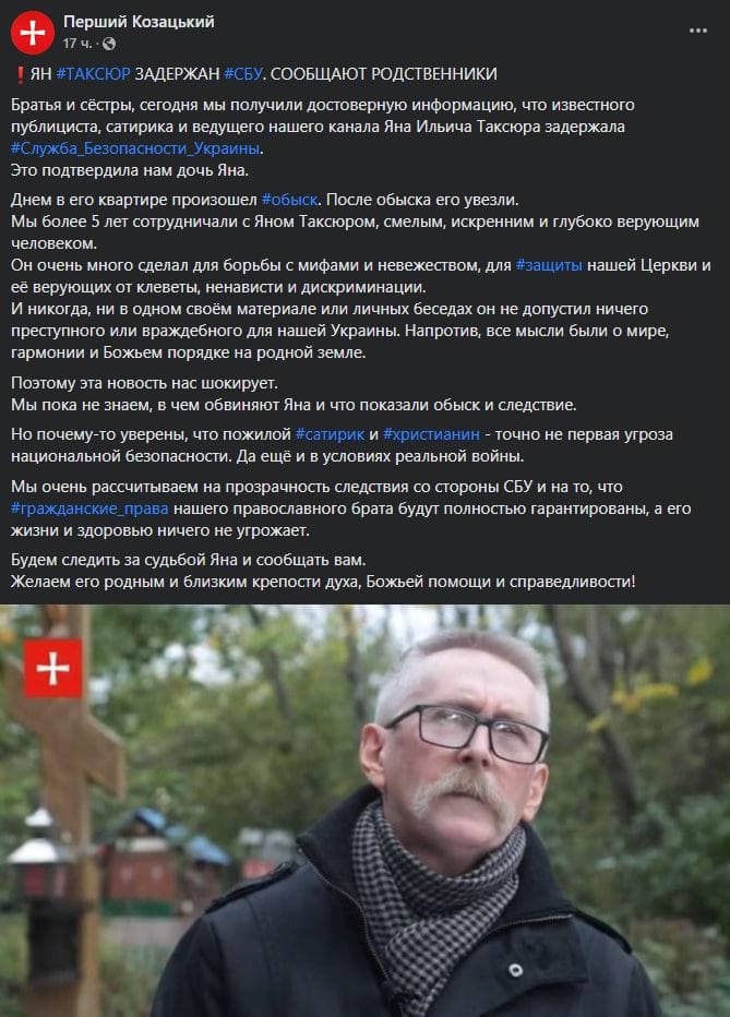 Сотрудники Службы безопасности Украины задержали украинского писателя Яна Таксюра. Об этом сообщает "Перший Козацький" (Таксюр - ведущий на этом канале).