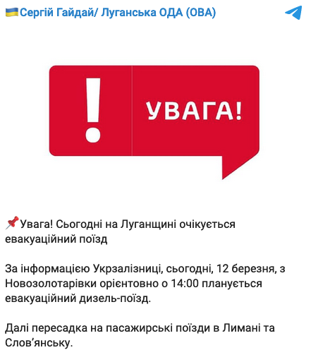 "Внимание! Сегодня в Луганской области ожидается эвакуационный поезд По информации Укрзализныци, сегодня, 12 марта, из Новозолотаровки ориентировочно в 14:00 планируется эвакуационный дизель-поезд", - говорится в сообщении.