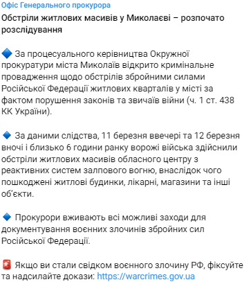 "При процессуальном руководстве Окружной прокуратуры города Николаев открыто уголовное производство по обстрелам вооруженными силами Российской Федерации жилых кварталов в городе по факту нарушения законов и обычаев войны (ч. 1 ст. 438 УК Украины)", - говорится в сообщении.