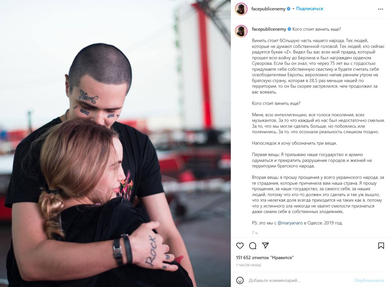 Российский рэпер Иван Дремин, выступающий под псевдонимом Face, осудил вторжение своей страны в Украину и попросил прощения у нашего народа. Соответствующий пост был опубликован в Instagram.