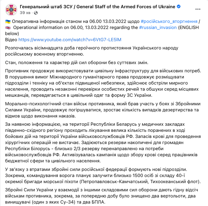 "По имеющейся информации, на территории Республики Беларусь в медицинских учреждениях юго-восточного региона проходит лечение большое количество раненых в ходе боевых действий на территории Украины военнослужащих РФ. Запасов крови для проведения хирургических операций не хватает. Задействуются резервы накопленные для граждан Республики Беларусь - около 2/3 резерва перенаправлено на нужды военнослужащих РФ. Активизировалась кампания по сбору крови среди работников бюджетной сферы и гражданского населения", - говорится в тексте.