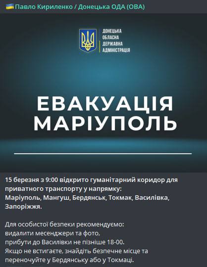 10.41 Из Мариуполя сегодня вновь, как и вчера, можно будет выехать на частном транспорте. Гуманитарный коридор открыт с 09:00. Об этом пишет губернатор Донецкой области Павел Кириленко.