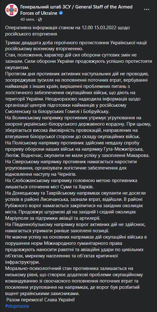 Во вторник, 15 марта, идёт двадцатый день войны в Украине. Утром российские снаряды попали в многоэтажку Подольского района Киева, жилые дома в Святошинском и Дарницких районах, ударной волной повредило станцию метро Лукьяновская. Информация о пострадавших уточняется.