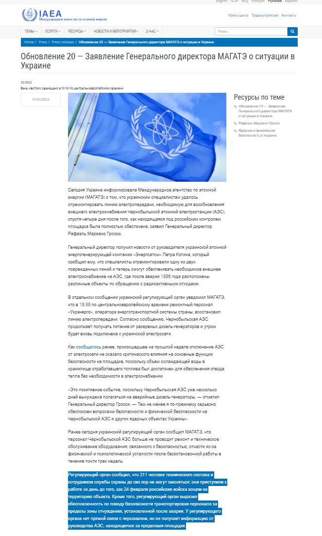 Напомним, 9 марта Чернобыльская АЭС была полностью обесточена.