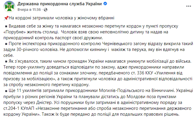 Государственная пограничная служба Украины сообщает от том, что на пункте пропуска "Порубное", который находится на участке государственной границы "Украина-Румыния", задержали мужчину переодетого в женскую одежду. Таким образом он пытался покинуть страну, избежав мобилизации.