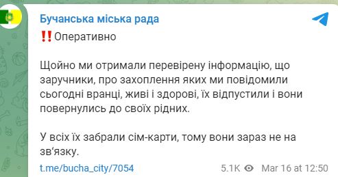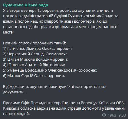 10.48 Бучанский горсовет заявляет, что россияне взяли в плен сотрудников и волонтеров.