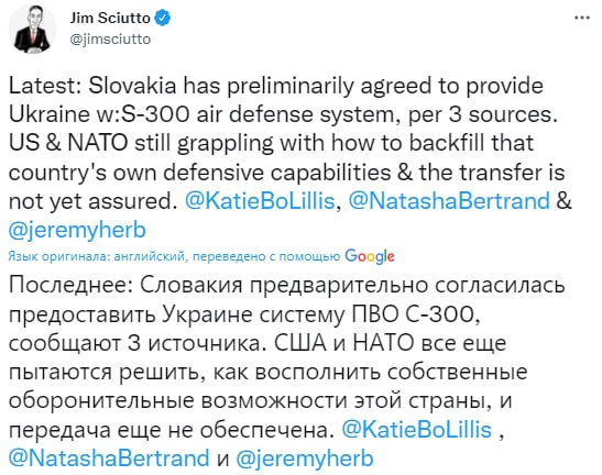 20.59 CNN cообщает, что Словакия готова передать Украине зенитно-ракетные комплексы С-300, если НАТО ей компенсирует эти потери. При этом на Западе пока говорят о том, что компенсировать комплексы ПВО для Словакии пока нечем. То есть, пока в Украину С-300 не поедут.