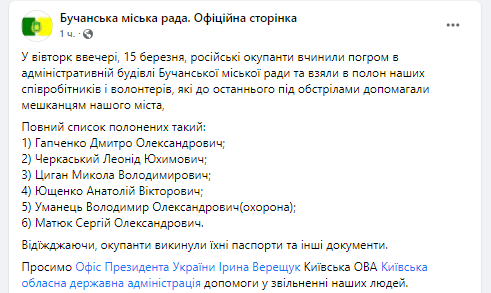 Кроме того, в горсовете добавили, что российские военные, когда уезжали, выбросили паспорта пленных и другие документы. В связи с этим Бучанский городской совет обратился к Офису президента Украины, вице-премьеру Ирине Верещук, Киевской ОВА, Киевской областной государственной администрации, чтобы они помогли с освобождением сотрудников.