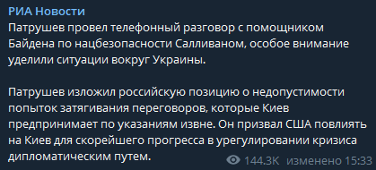 "Патрушев заявил Салливану о недопустимости попыток затягивания переговоров, предпринимаемых Киевом извне", - сообщили в СБ РФ.