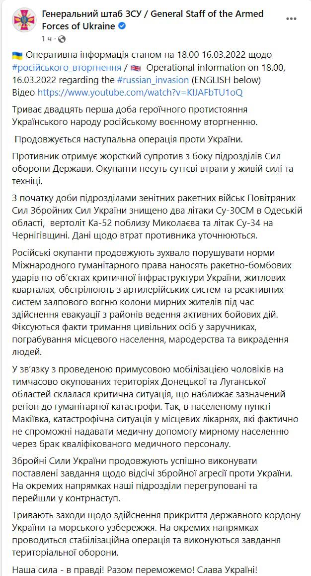 Сводка Генштаба за 16 марта. Фото: Генеральний штаб ЗСУ / General Staff of the Armed Forces of Ukraine