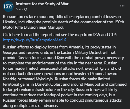 "Российские силы добились ограниченных территориальных успехов в Донецкой области и вокруг Мариуполя и продолжали наносить удары по гражданской инфраструктуре города. Российские силы, вероятно, продолжат сокращать Мариупольский котел в ближайшие дни, но они, вероятно, по-прежнему не в состоянии проводить одновременные атаки на нескольких направлениях наступления", - сообщает институт.