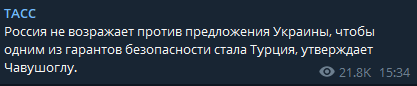 Также, по его словам, Россия не возражает против предложения Украины, чтобы одним из гарантов безопасности стала Турция.