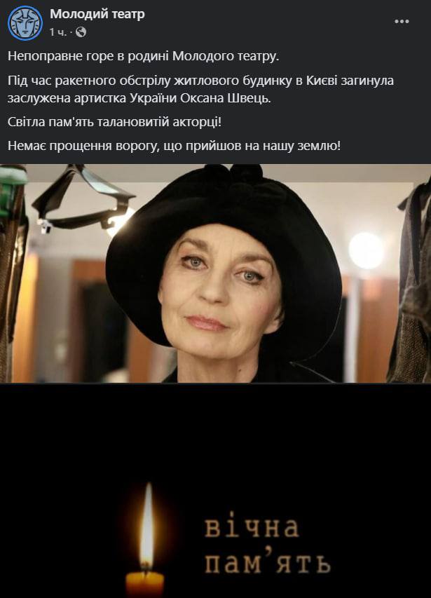 Во время ракетного обстрела Киева погибла заслуженная артистка Украины Оксана Швец.