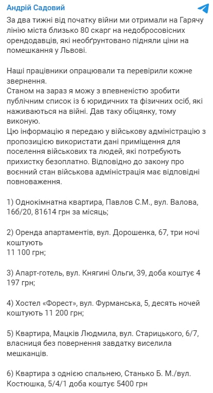 16 марта градоначальник Львова Андрей Садовой опубликовал список самых вопиющих таких случаев - тех, "кто наживается на войне". Всего их оказалось шесть, хотя жалоб на горячую линию горсовета поступило более 80-ти.
