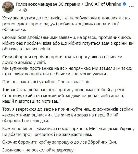 "Своими безответственными заявлениями, вроде, противник что-то вроде бы без проблем взял или что якобы готовится сдача страны, вы оскорбляете наших воинов. Силы обороны героически противостоят противнику, которого называли второй армией в мире. Мы остановили противника по всем направлениям. Мы нанесли им такие потери, которых они никогда не видели и не могли представить", - написал Залужный.