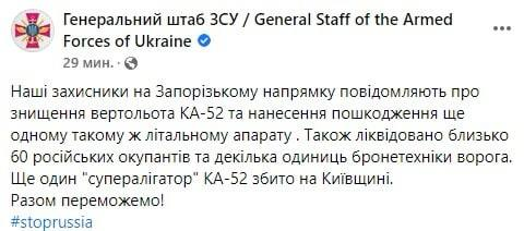 "Наши защитники в Запорожском направлении сообщают об уничтожении вертолета КА-52 и нанесении повреждения еще одному такому же летательному аппарату. Также ликвидировано около 60 российских оккупантов и несколько единиц бронетехники врага. Еще один "супералигатор" КА-52 сбит на Киевщине. Вместе победим!" - указано в сообщении.