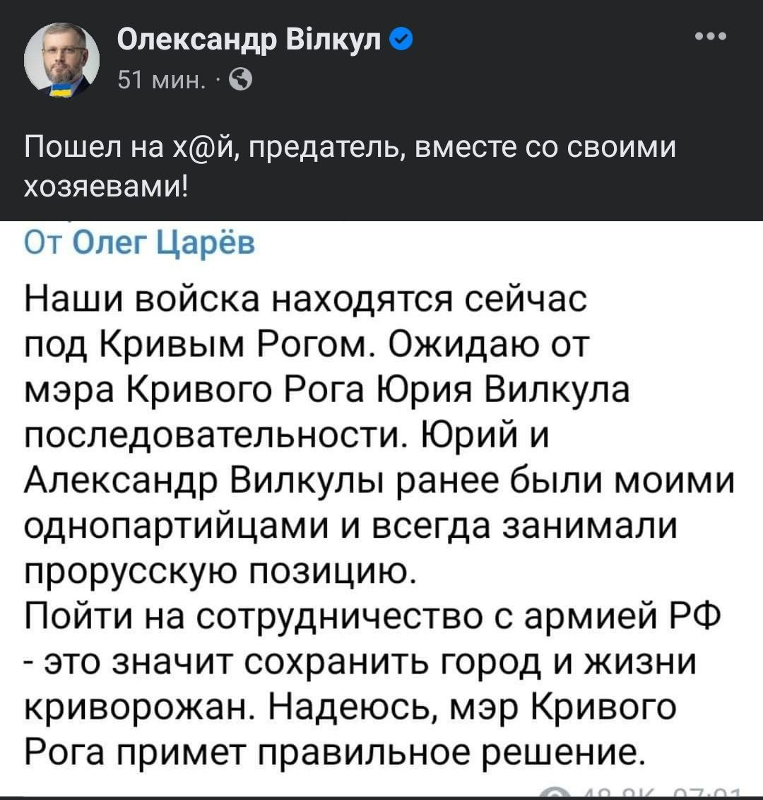 Начальник военной администрации Кривого Рога Алесандр Вилкул отреагировал на этот призыв очень резко: "Пошел на х@й, предатель, вместе со своими хозяевами!".