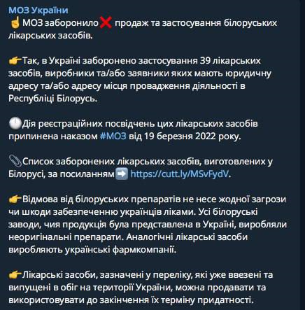При этом в ведомстве утверждают, что отказ от белорусских препаратов не несет никакой угрозы или вреда украинцам, так как все белорусские заводы, чья продукция продавалась на территории нашей страны, производили подделки. У каждого препарата есть свои аналоги в Украине. Лекарства из перечня, которые уже завезли на территорию Украины, можно будет продавать и использовать до истечения срока годности.
