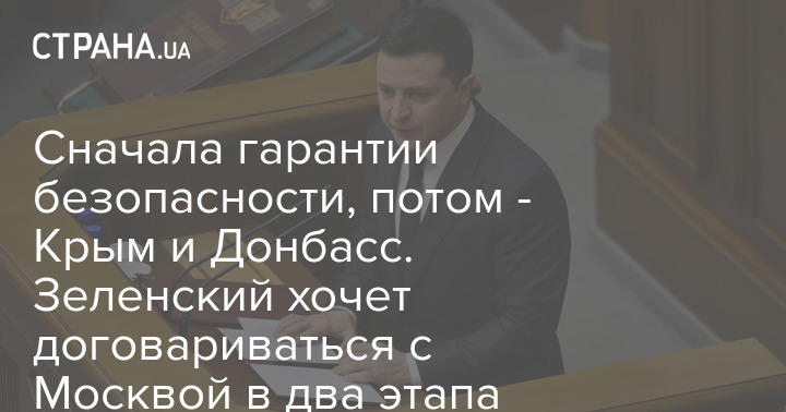 Президент Украины Владимир Зеленский видит два этапа договоренностей с Москвой. Первый - решить вопрос по гарантиям безопасности Украины. Второй - обсуждение статуса Крыма и Донбасса.