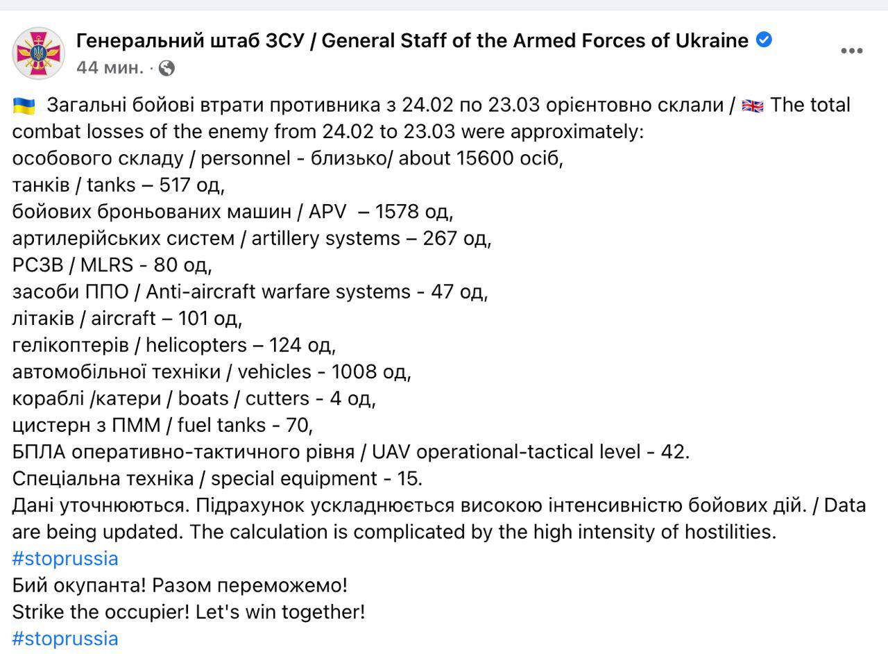 Генштаб ВСУ озвучил общие боевые потери противника в войне с Украиной за период с 24 февраля по 23 марта.