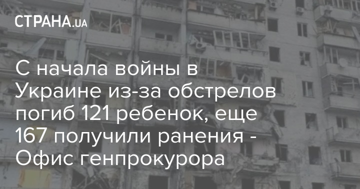 С начала войны из-за обстрелов погиб 121 ребенок, 167 детей ранены. Об этом в Facebook сообщает Офис генпрокурора.