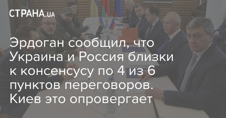 Президент Турции Реджеп Эрдоган заявил, что Украина и Россия близки к консенсусу по 4 из 6 пунктов переговоров о мире.