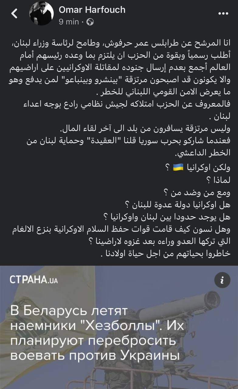 "Хезболла обладает регулярной армией, которая сдерживает врагов Ливана. Когда они участвовали в войне в Сирии, мы говорили о защите Ливана от угрозы ИГИЛ. Но при чем тут Украина? Украина – враг Ливана? Есть ли граница между Ливаном и Украиной? Разве мы забыли, как украинские миротворцы обезвреживали мины, оставленные врагом после вторжения на наши земли? Если члены Хезболла поедут воевать в Украину, то они станут наемниками и поставят под угрозу национальную безопасность Ливана", - написал Арфуш.