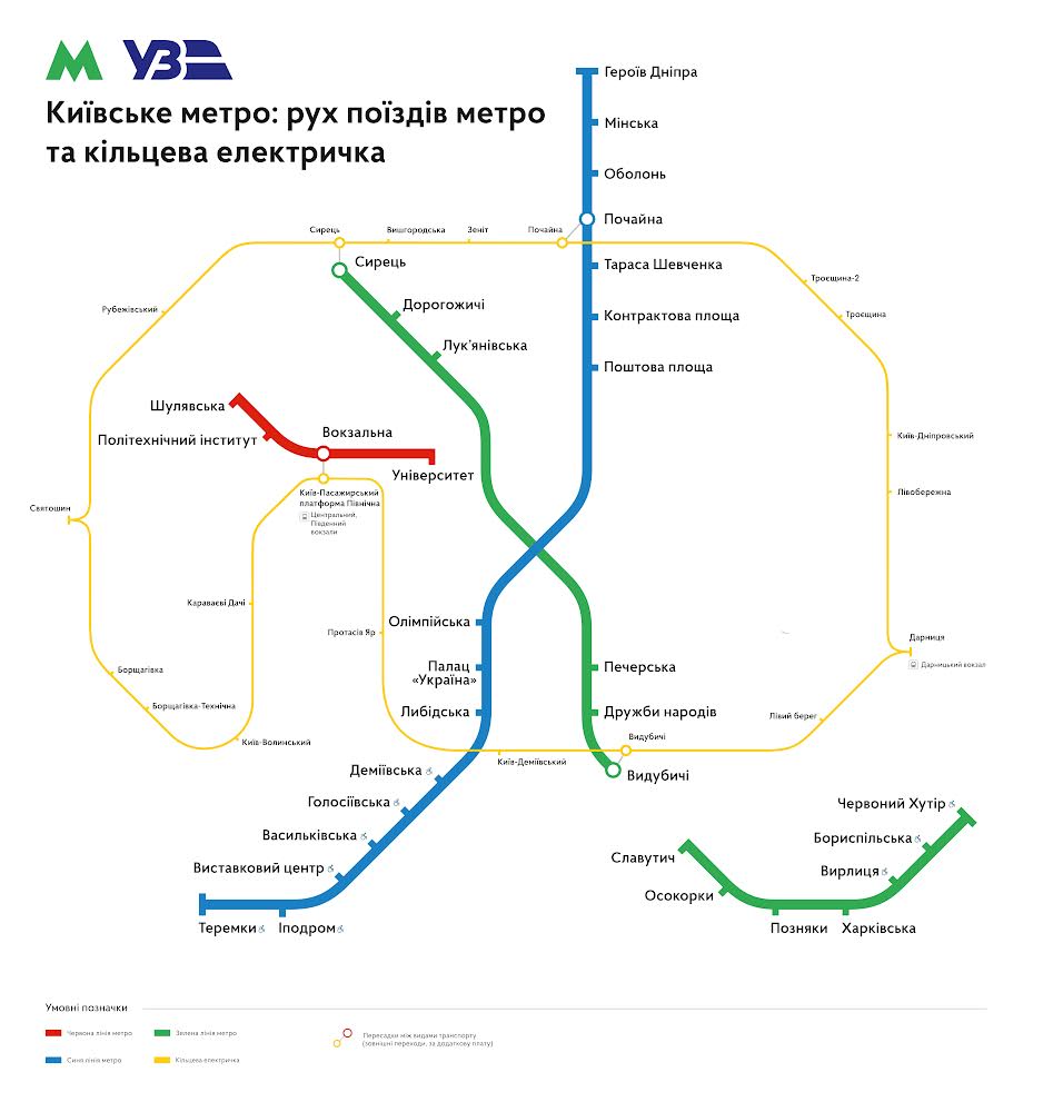 Зеленая линия работает от ст. "Сырец" до ст. "Выдубичи (без остановки "Дворец спорта", "Кловская", "Золотые ворота", также работает участок "Славутич" – "Красный хутор").