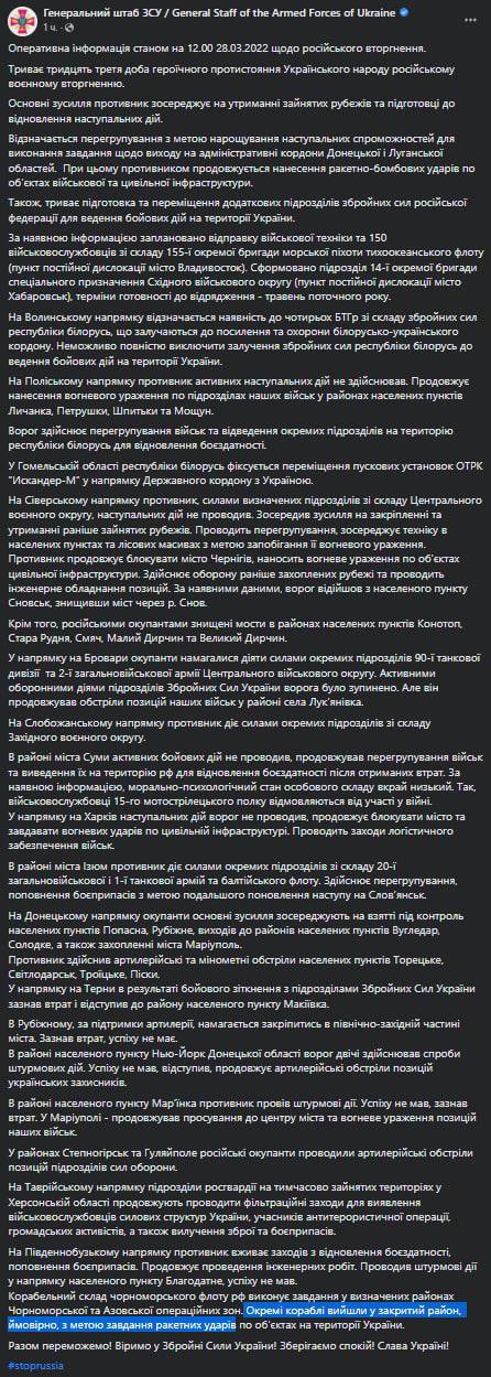 • в Мариуполе противник продолжил продвижение в центр города и огневое поражение позиций украинских войск.