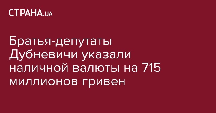 В общем на двоих братья-нардепы из Львовской области держат в наличных деньгах свыше полумиллиарда гривен (578,4 млн грн), а с учетом наличных денег, задекларированной женой Богдана Дубневича – свыше 715 млн грн.