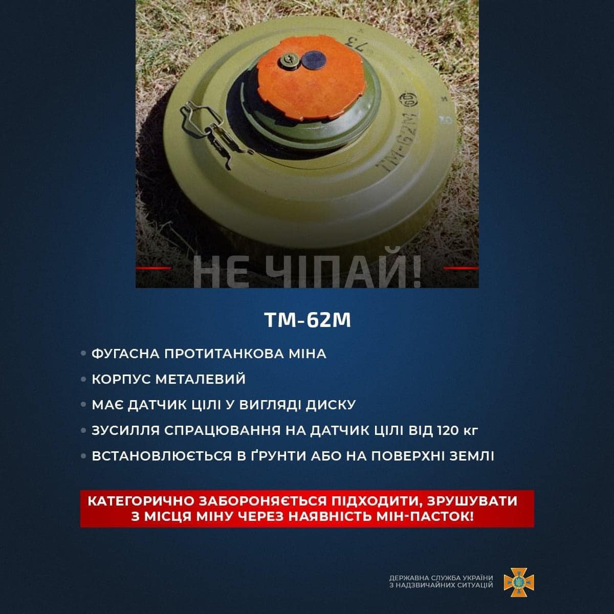 Фугасная противотанковая мина ТМ-62М имеет датчик цели в виде диска, защищена металлическим корпусом и зачастую устанавливается прямо на земле. Срабатывает при нажатии веса от 120 килограмм. Перемещать такие мины категорические запрещено из-за возможных ловушек.