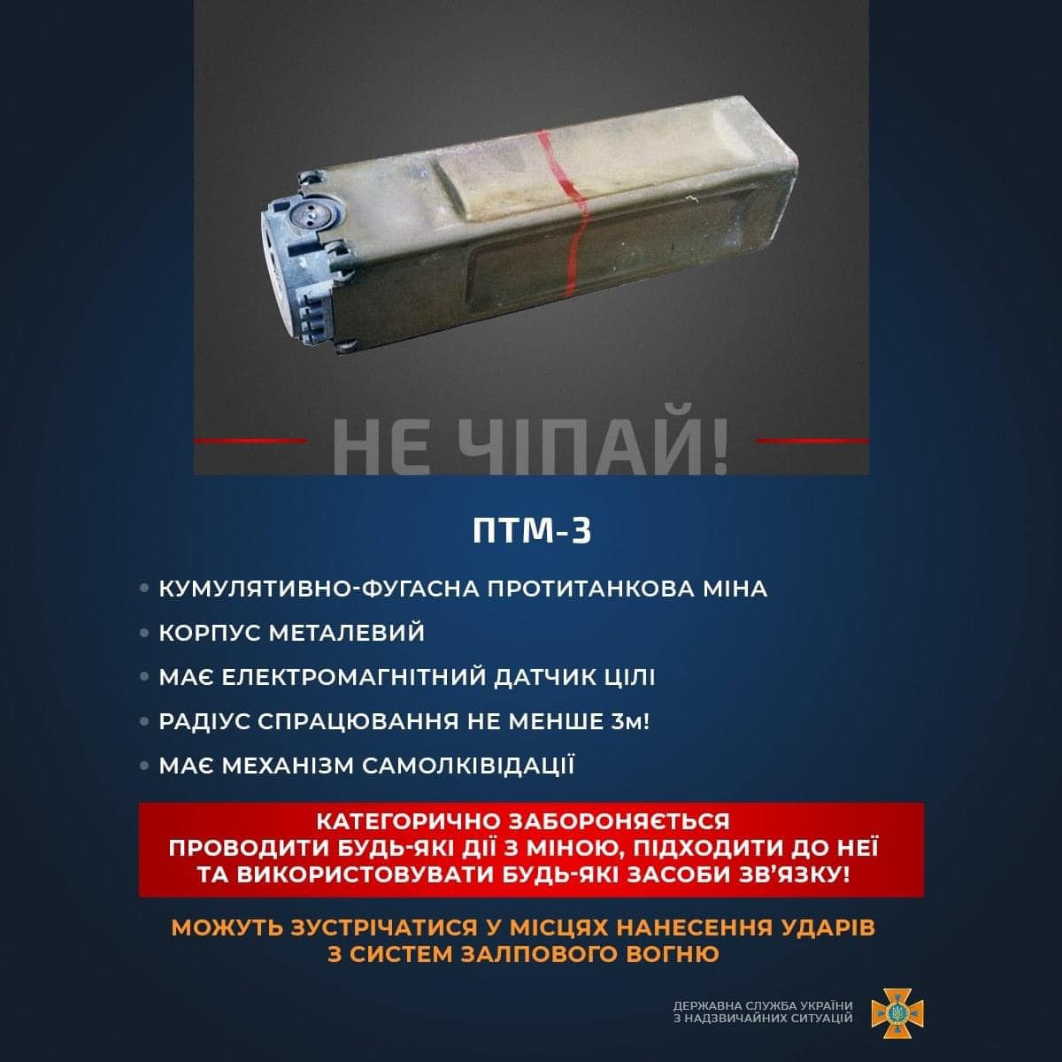 Кумулятивно-фугасная противотанковая мина ПТМ-3 в форме параллелепипеда, состоит из металла. Оснащена электромагнитным датчиком цели с радиусом действия от трех метров. Может произвольно взрываться из-за наличия системы самоуничтожения. Такие мины нередко находят в местах, пострадавших от нанесения удара системами залпового огня.