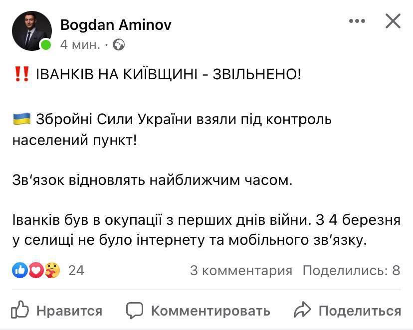 10.08 Журналист Богдан Аминов сообщает, что пгт Иванков (80 километров к северу от Киева, около Чернобыльской зоны) освобождён ВСУ. Судя по всему, российские войска ушли и оттуда.