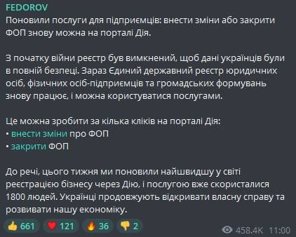 Кроме этого, Федоров добавил, что на этой неделе восстановили регистрацию бизнеса через "Дию", услугой уже воспользовались 1800 человек.