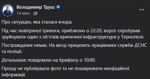 09.40 В Тернополе вчера в 22:20 российские войска ударили по одному из объектов критической инфраструктуры.