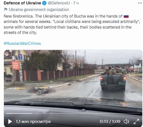 Минобороны Украины в Твиттере заявило, что люди убиты российскими войсками и назвало это "новой Сребреницей" - делая отсылку к резне боснийских мусульман во время войны в Югославии.