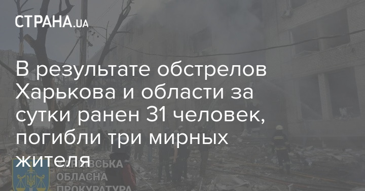 В результате вчерашних обстрелов Харькова и области ранен 31 человек, в том числе четверо детей. Погибли три мирных жителя.
