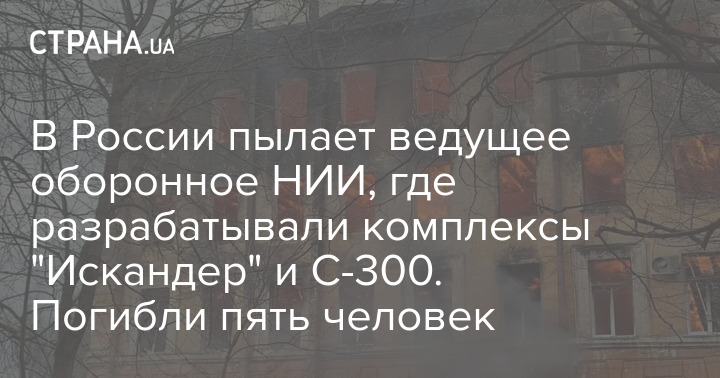 В российской Твери пылает здание оборонного НИИ, в котором разрабатывались оперативно-тактические комплексы "Искандер" и С-400. Площадь пожара достигла 1500 квадратных метров. В здании обрушилась крыша. По предварительным данным, в результате ЧП погибли пять человек и 21 - получил ранения. Об этом сообщают российские СМИ.