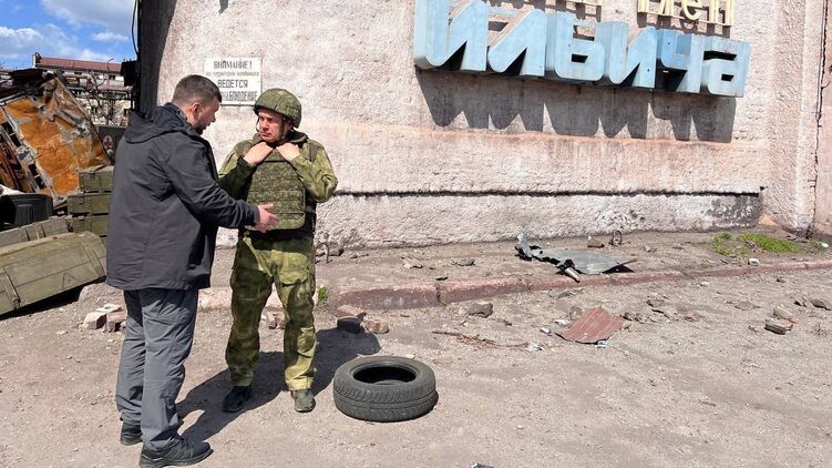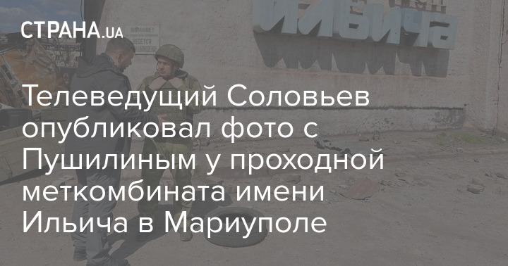 Российский телеведущий Владимир Соловьев вместе с "главой ДНР" Денисом Пушилиным сфотографировался у проходной меткомбината имени Ильича в Мариуполе.