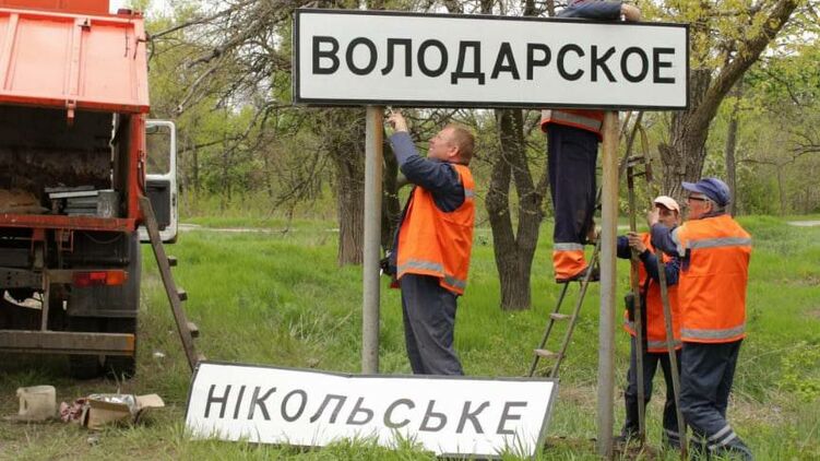 4 мая в пгт Никольское Донецкой области заменили указатели с нынешним названием на прежнее – Володарское, о чем сообщили донецкие Телеграм-каналы.
