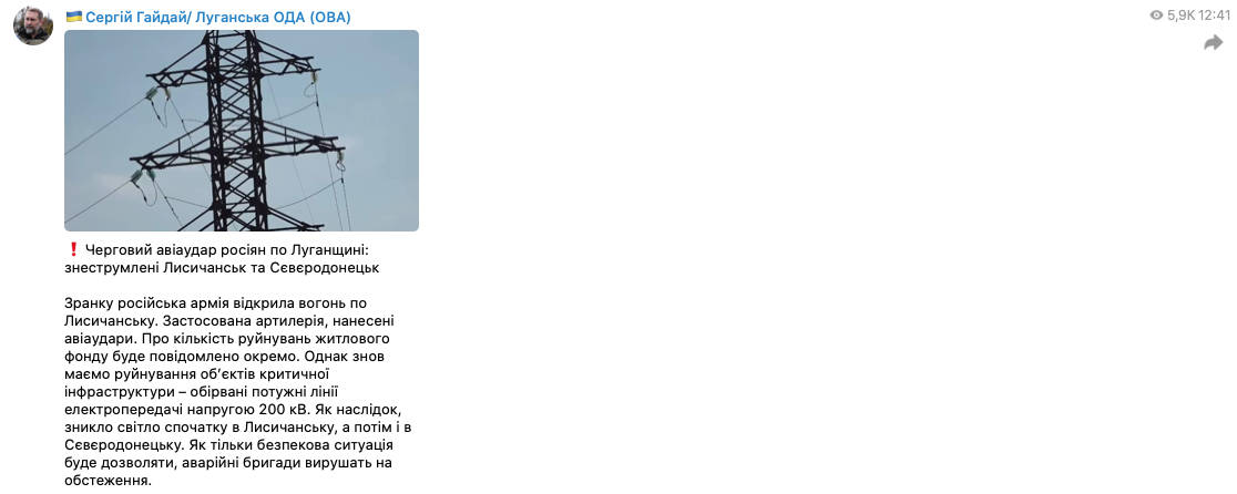 Гайдай сообщил об обесточивании Северодонецка и Лисичанска. Фото: ЛВГА